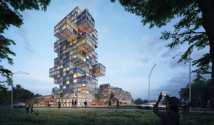 An einem Ende des Geländes soll ein imposanter Vier-Sterne-Hotelturm mit 250 Zimmern entstehen. Auffällig ist der Hotel-Entwurf aber nicht nur hinsichtlich seiner Form. Eyecatcher sind Fassadenpaneele aus Faserbeton, die vor dem Fenster sitzen und eine Vielzahl von Symbolen zeigen, die von der kreativen Leistung der Einheimischen inspiriert sind. Denn Kreativität ist in diesem Viertel schon länger beheimatet: Derzeit steht an der Stelle des künftigen Komplexes nämlich noch das W8 Medienzentrum, im dem rund 40 Firmen und damit eine bunte Gemeinschaft im Sinne des Coworking-Konzeptes zusammenarbeiten. Die bestehende Struktur des W8 als Gewerbeeinheit soll laut Architekten erhalten bleiben und das Projekt KoolKiel prägen. Außerdem basiere der Entwurf auf einem flexiblen Designsystem, sodass Bedürfnisse und Wünsche der Arbeitsgemeinschaft berücksichtigt werden können. Neben dem Hotelturm entstehen ein weiteres Hochhaus, ein Büroturm mit voraussichtlich zwölf Geschossen, mehrere kleine kubische und rechteckige Bauten. Wer der Betreiber des Hotels werden soll, ist noch nicht bekannt.