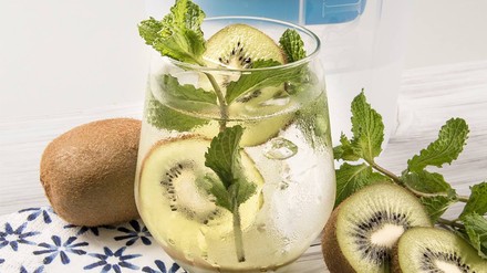 Kiwi und Minze harmonieren nicht nur farblich. Die Kombination aus fruchtigen und frischen Aromen erfrischt einfach herrlich. Für einen Liter Wasser drei Kiwis schälen und in Scheiben schneiden. Dann eine Handvoll Minzblätter Waschen und beides ins Wasser geben. Einige Zeit ziehen lassen und kalt genießen.