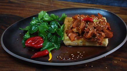 Eine köstliche Idee, die der Trendscout im Messegepäck hat, sind beispielsweise Waffeln. Die sind ein Klassiker und natürlich nicht neu, was Andrew Fordyce damit anstellt, dagegen schon: „Der Clou ist, Waffeln mit etwas Salzigem zu präsentieren. In den UK werden sie gerne mit Geflügel kredenzt“, sagt er. Mit Yummy trendfood hat er sich natürlich auch wieder selbst etwas ausgedacht und schlägt sie seinen Kunden in Kombination mit der BBQ Pulled Jackfruit vor. Internationaler und trendiger geht es nicht: eine vegetarische Liaison von der Südstaaten-, belgischen und asiatischen Küche.