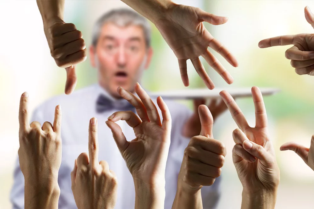 Der Kellner zeigt seinem Chef den Mittelfinger