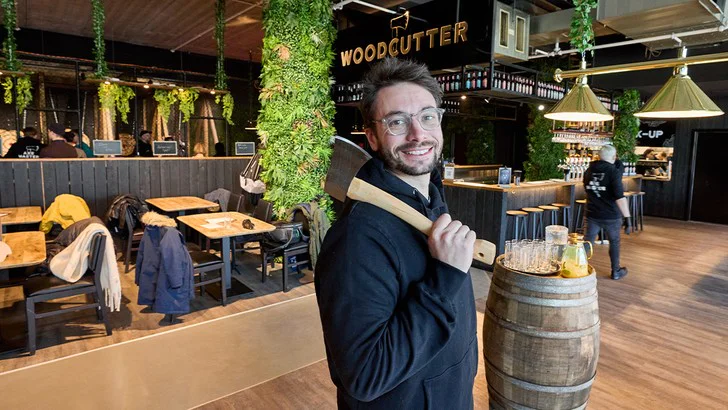 Es gibt mehrere Anbieter, eines ist das Unternehmen WoodCutter, das in diesen Tagen seinen nächsten Standort in Köln eröffnet. Aron Lack, der Mann mit der Doppelaxt, ist daher gekommen, um das urwüchsige Hobby mal vorzuführen. Er ist für den Bau der Bars zuständig.