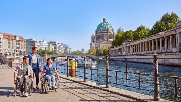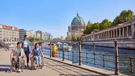 Drei Menschen, darunter zwei Rollstuhlfahrer, spazieren gemeinsam am Berliner Spreeufer mit Blick auf den Berliner Dom und die Museumsinsel
