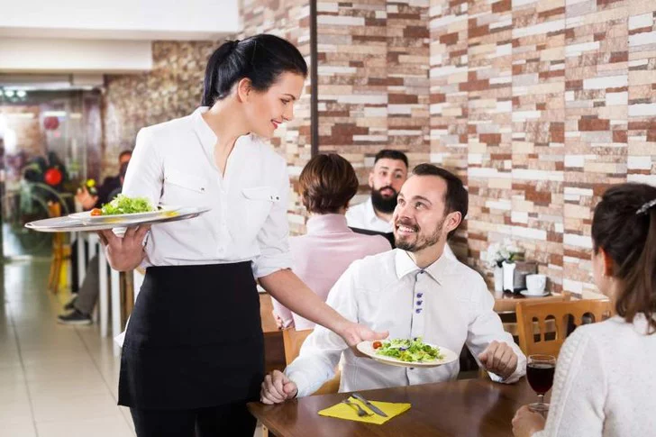 Eine freundliche Servicekraft serviert lächelnden Gästen Salate