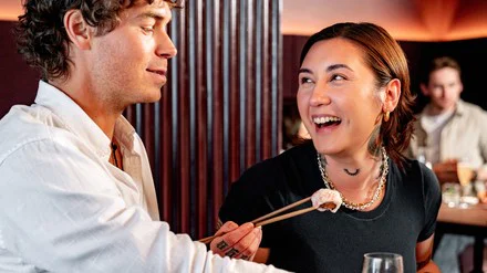 Danach wird gerollt: zur Wahl stehen Crispy Ebi mit Tempura-Garnelen und scharfer Sauce, Spicy Tuna mit Gurke, Masago und Kresse oder Mamma Mia mit Avocado, Gurke und Sesam. Vom Grill folgen zwei Sticks pro Person, etwa Tsukune – Hähnchenbällchen mit Teriyaki, Shake Teriyaki – gegrillter Lachs mit Frühlingszwiebeln, Shishito Yaki – Padron-Paprika mit Gochujang und Limette oder Eringi Yaki – Kräutersaitlinge mit Misokräutersauce.