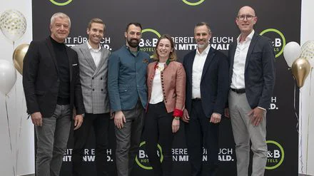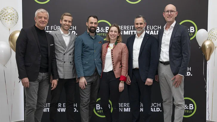 Arno Schwalie (CEO B&B HOTELS CNE), Jan Grossmann (COO B&B HOTELS CNE), Clemens und Celia Ebmeier (Hoteliers B&B HOTEL Mittenwald), Enrico Corongiu (Bürgermeister Mittenwald), Tobias Gollnest (CDO B&B HOTELS CNE)