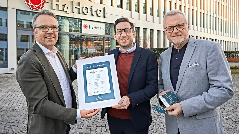 geleitet. Jürgen Schmieder, Director of Food der H-Hotels und Philipp Kempers, Cluster F&B Manager H4 und H2 Hotel München Messe, nahmen die Zertifikate aus den Händen von Torsten von Borstel, Geschäftsführer der UAW, entgegen.