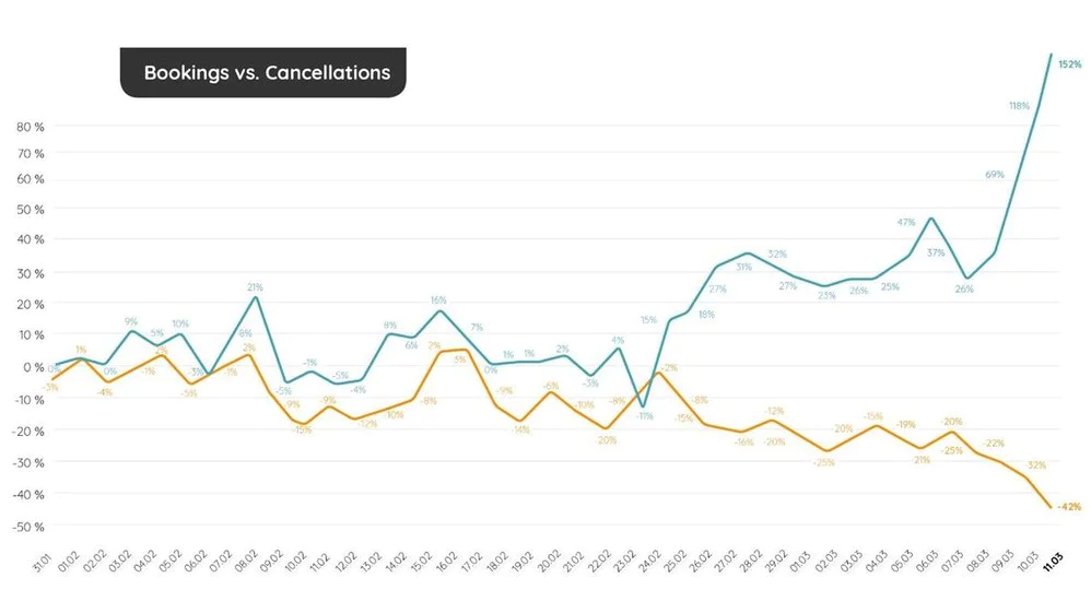 Basierend auf Echtzeit-Daten wurde am 11. März das erste Mal ein Buchungsrückgang von 42 Prozent im Vergleich zum Vorjahr verzeichnet. Die Trendlinie verläuft allgemein seit dem 10. Februar rückläufig mit Ausnahme eines Wochenendes (15. und 16. Februar). Seitdem entwickelt sich die Anzahl der Buchungen, unabhängig der Buchungsquelle, negativ. Gleichzeitig werden Urlaube seit dem 24. Februar vermehrt abgesagt und aktuell eine Stornierungsrate von bis zu 152 Prozent im Vorjahresvergleich erreicht.