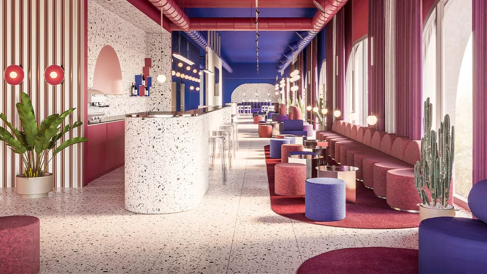 So erlebt der damals gefeierte „Memphis-Stil“ mit seinen leuchtenden Farben und wirren Formen, Linien und Strukturen im Ibis Styles München Perlach sein Revival. Die Primärfarben Rot und Blau sowie kräftige Magenta- und Lilatöne dominieren in der Farbgebung und treffen auf weiß gemusterte Oberflächen.