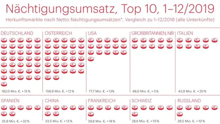 24 von Wiens 30 aufkommensstärksten Märkten entwickelten sich im Jänner positiv – außerhalb der Top 10 stachen vor allem Israel (+76% auf 26.000 Nächtigungen) und Griechenland (+90% auf ebenfalls rund 26.000 Übernachtungen) hervor.