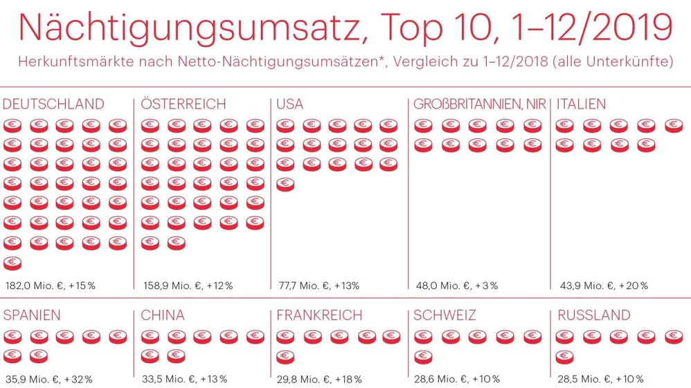 Auch die Nächtigungszahlen für Jänner 2020 liegen bereits vor: Mit 1.124.000 Übernachtungen registrierten Wiens Beherbergungsbetriebe um 11,1 Prozent mehr als im Vergleichsmonat 2019. Bis auf Österreich, das auf dem Niveau des Vorjahresmonats blieb, brachten Wiens nächtigungsstärkste Herkunftsmärkte des heurigen Jänners ein Plus: Russland, USA, Großbritannien, Spanien, Frankreich und die Ukraine wuchsen einstellig, Deutschland, Italien und China zweistellig. Das Wachstum aus China (+11,1% auf 1,1 Millionen) ist auf eine Verschiebung der Feiertage zurückzuführen: 2019 fiel das chinesische Neujahr auf Februar, heuer bereits auf Jänner. Ohne das Corona-Virus und die damit einhergehenden Reiseeinschränkungen gegen Ende des Monats wäre das Wachstum aus China vermutlich noch deutlicher ausgefallen.