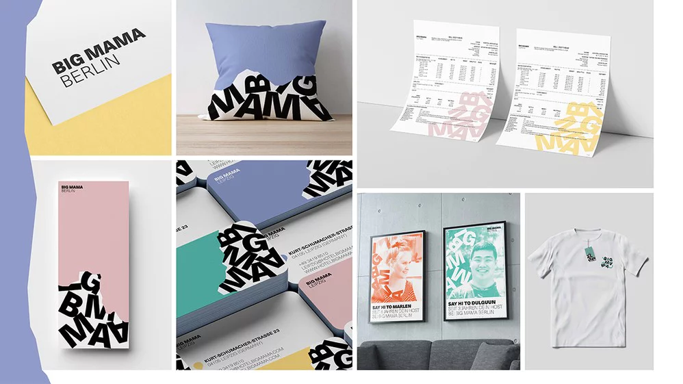 Das klare Logo ohne viel Chi-Chi erinnert an die praktisch strukturierten Zimmer von Big Mama. Das zugehörige Farbsystem ist bunt, wie die Menschen, die Big Mama so besonders und die vielfältigen Eigenschaften, die die Hotels so überraschend anders machen. Es kann von lebendig und laut bis entspannt und bedacht verschiedene Stimmungen erzeugen. Alles andere als Standard, die diesen auch bewusst brechen, sind die eingesetzten Gestaltungselemente, die den selbstbewussten Charakter der Marke unterstreichen und auf den unterbewussten Bedürfnissen der Zielgruppe beruhen. Die großen, angeschnittenen Farbflächen, die Inhalte teilweise verdecken können und der spielerische Umgang mit Typografie laden dazu ein, sich länger mit der Gestaltung auseinanderzusetzen und Dinge zu entdecken. Bereits der erste visuelle Eindruck der Marke Big Mama soll Lust auf mehr machen und zeigen, wie vielfältig und lebendig das Erlebnis dort ist.