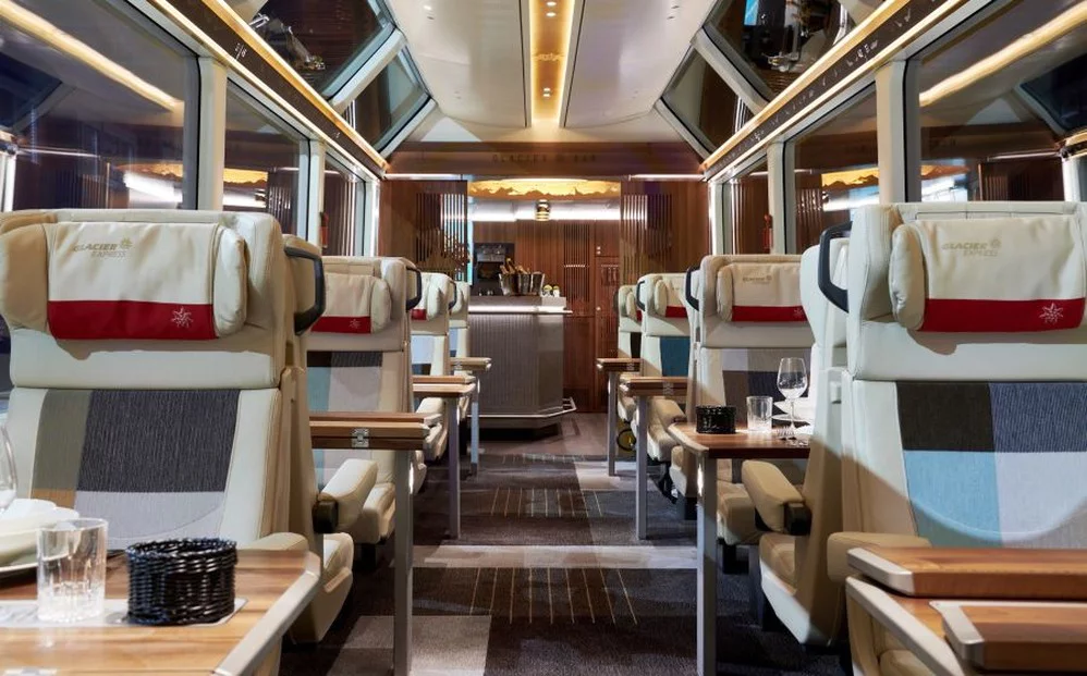 So luxuriös war eine Bahnfahrt durch die Schweizer Alpen noch nie. Die Passagiere der neuen Excellence Class im Glacier Express sollen Komfort, Aussicht und Kulinarik genießen können. Auf den garantierten Fensterplätzen mit Panoramasicht geht es über 291 Brücken und durch 91 Tunnels in einer 8-stündigen Fahrt zwischen St. Moritz und Zermatt.