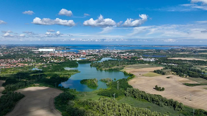 Luftaufnahme der Hansestadt Wismar an der Ostsee in Mecklenburg-Vorpommern im Sommer