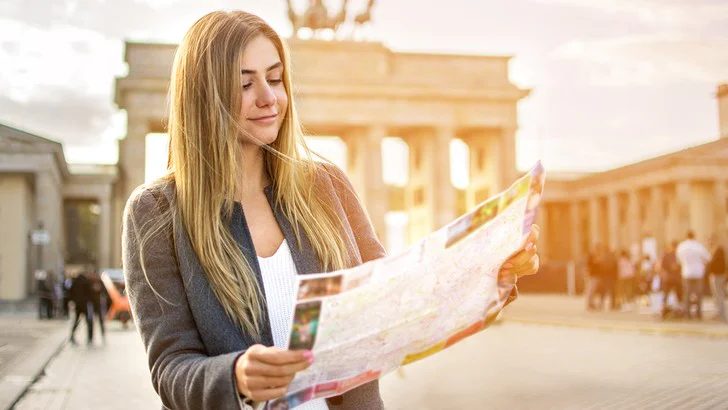 Frau mit Stadtkarte vor dem Brandenburger Tor